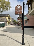 Photograph of the street leading to Castillo de San Marcos, featuring a signpost and surrounding historical buildings.
