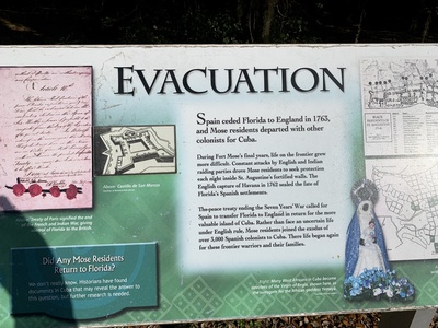 Panel titled 'Evacuation,' detailing the 1763 cession of Florida to England and the relocation of Fort Mose residents to Cuba.
