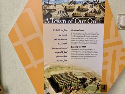 An informational display titled 'A Town of Our Own,' describing the establishment of Fort Mose as the first free African settlement in what is now the United States.
