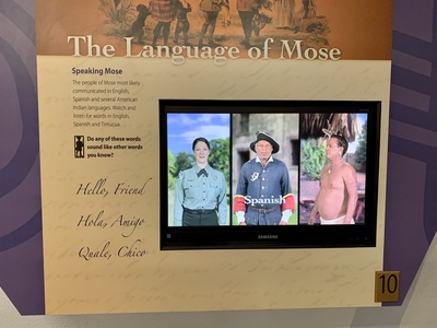 A display titled 'The Language of Mose' featuring information on the multilingual nature of the Fort Mose community, including English, Spanish, and Timucuan languages.