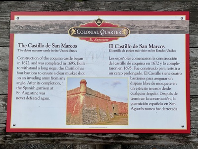 Information panel on the Castillo de San Marcos, describing its construction and historical significance as the oldest masonry fort in the United States.